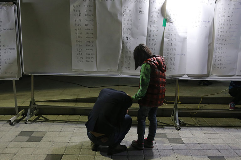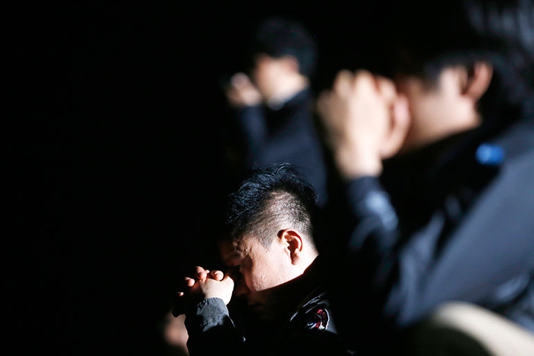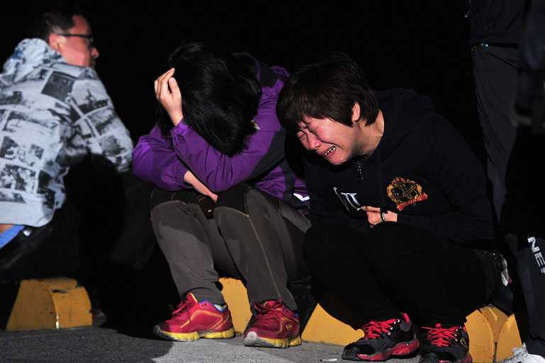隨時間一分一秒過去,下落不明者處境愈來愈不樂觀,他們的親人在珍島港邊苦苦守候,祈禱奇蹟出現。