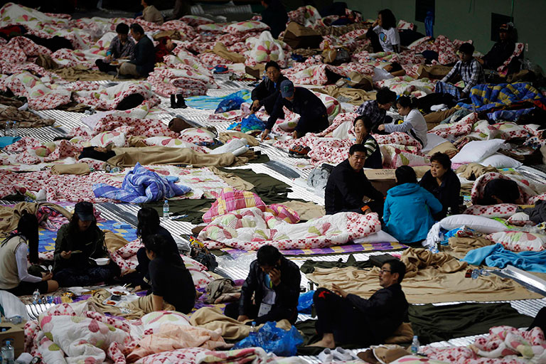 乘客家屬聚集在珍島一處體育館等候救難隊消息。